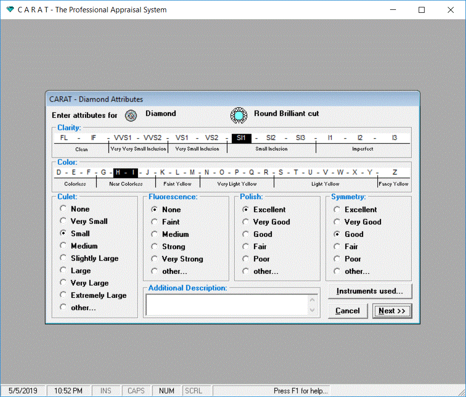 Significant number of attributes can be specified for each diamond to complete the appraisal.