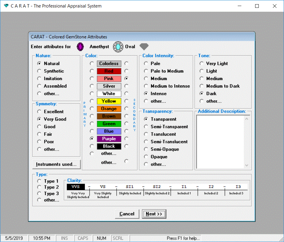 Significant number of attributes can also be specified for each gemstone to complete the appraisal.