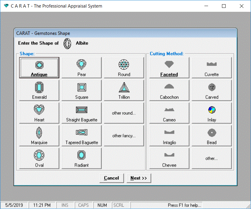 Note that selecting the correct shape and cut enables CARAT to estimate the weight